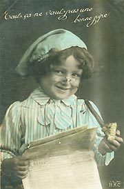 Cet enfant fume une pipe en terre cuite, plus précisément