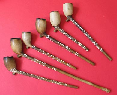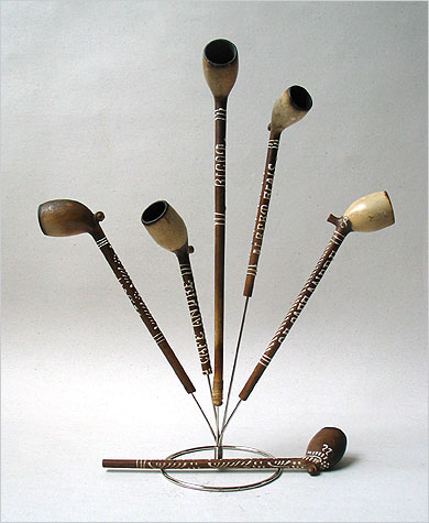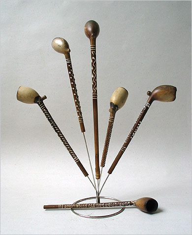 Exceptionnel et rare ensemble de pipes à tuyau en terre blanche (circa 1890/1910) dont le culottage laisse apparaître le décor et les mentions réalisés à l'émail blanc. Rare, puisque ces "terres" proviennent à l'évidence d'un ou de plusieurs rateliers d'un établissement du nord de la France, peut-être également de la Belgique, le "Grand Café André" ! Exceptionnel d'autre part, puisque ces pipes